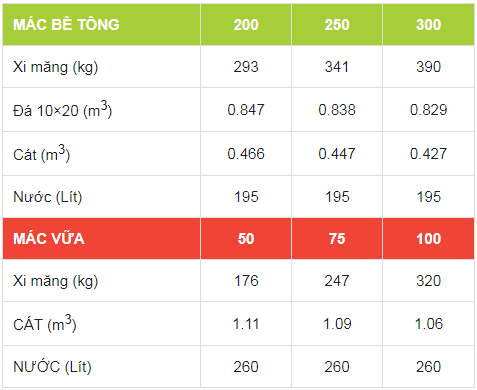 TỶ LỆ CẤP PHỐI THAM KHẢO CHO 1M3 BÊ TÔNG, VỮA XÂY TÔ